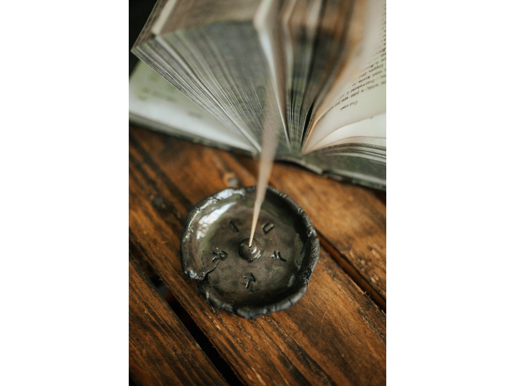 Ručně vytvořený stojánek z tmavé keramické hlíny a vtisknutými runami.