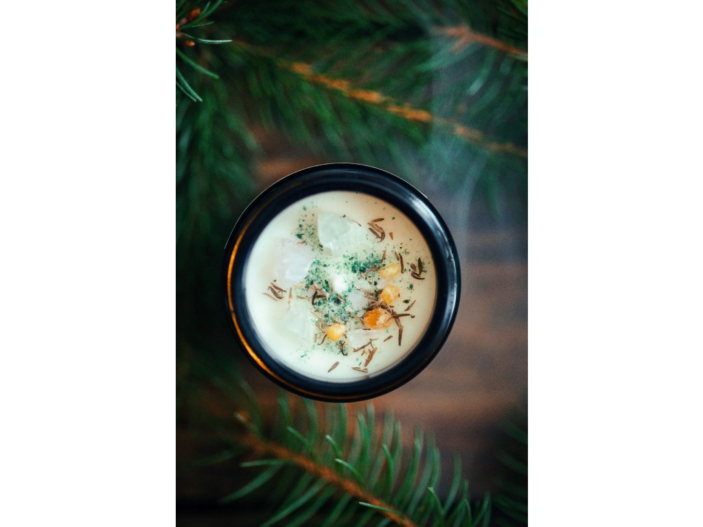 Svíčka "Hoa hoa hoa season" je přesně spojením těchto vůní. Ideální na upršené dny, kdy si pustíš Twilight, dáš si horký čaj a zachumláš se do deky. Použila jsem esenci ze smrku, plodu jalovce, kadidlovníku pravého a kapku kardamomu. Tato směs ti uleví při dýchacích potížích, posiluje imunitu, uklidňuje a pomáhá při nervovém vyčerpání. Svíčka je zdobená ametystem a fluoritem, doplněná o kadidlo a tymián.