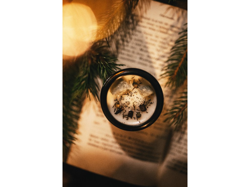 Svíčka s esencí ze smrku, jedle a borovice ti navodí dokonalou atmosféru vůně vánočního stromečku. Je odzobena kousky šišky, tymiánem, zeleným pepřem, avanturínem a prachem z pyritu.